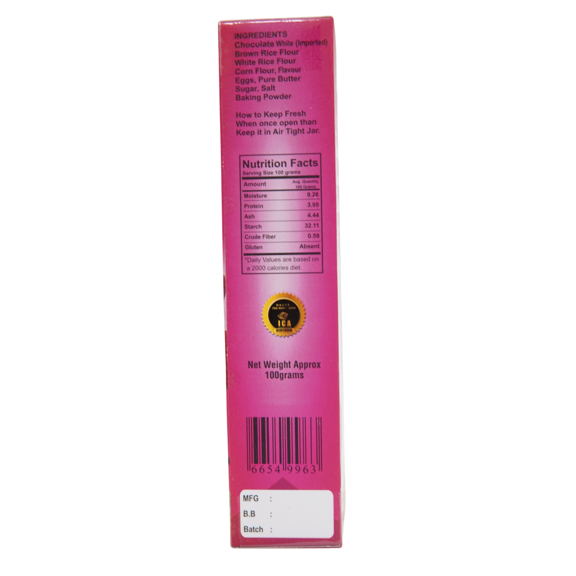 Treat yourself to Syed Flour Mills Strawberry Creamer Biscuits—light, gluten-free cookies infused with luscious white chocolate and natural strawberry flavor. Each 100 g pack contains premium imported white chocolate center, surrounded by a delicate biscuit made from brown rice flour, white rice flour, and corn flour, bound together with pure butter, eggs, sugar, salt, and a touch of baking powder for perfect texture. These biscuits are entirely wheat-free, making them safe for those with wheat allergies, celiac concerns, or anyone following a gluten-free lifestyle. Enjoy them straight from the box, paired with tea or coffee, or chilled for a refreshing strawberry-white chocolate experience. Syed Flour Mills’ commitment to quality and flavor ensures every bite is both wholesome and decadent—ideal for weight-conscious snackers, diabetic-friendly diets, and keto-compatible indulgence.